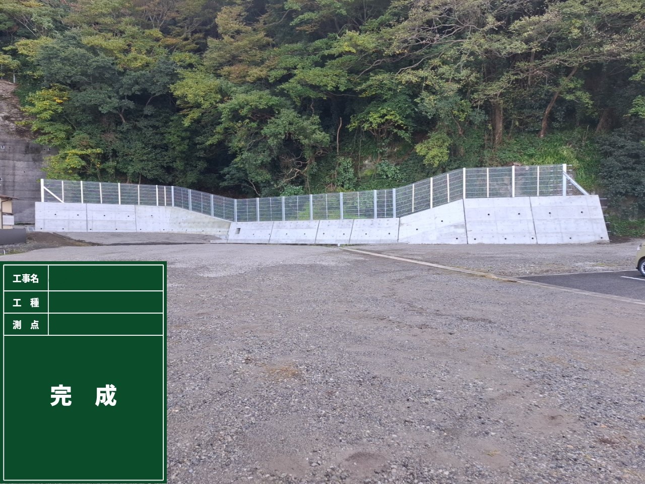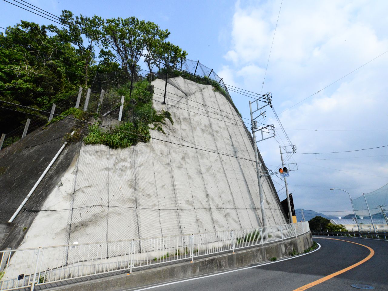 山の斜面などの「法面」をコンクリートや擁壁で保護する工事です。大雨や地震による土砂災害を防ぐなど、地域の安全を守ります。 -